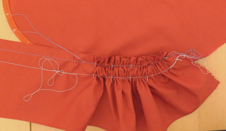 Wenn die Rüsche aufgesetzt werden soll näht man zum kräuseln am besten zwei Fäden. Damit beim feststecken der Rüsche nicht ständig die Breite des oberen Teils nachmessen muss habe ich die Kräuselfäden so platziert, dass ich diese als Referenz nehmen kann. Dazu näht man den ersten Faden genau an die gewünschte Breite abzüglich der Nahtzugabe des Stücks, auf dass aufgenäht werden soll. Den zweiten Faden dann an die gewünschte Breite zuzüglich der Nahtzugabe. Beim feststecken und kräuseln legt man dann den Faden genau an die Kante des Stoffs. Hier ist das der hellere Faden.