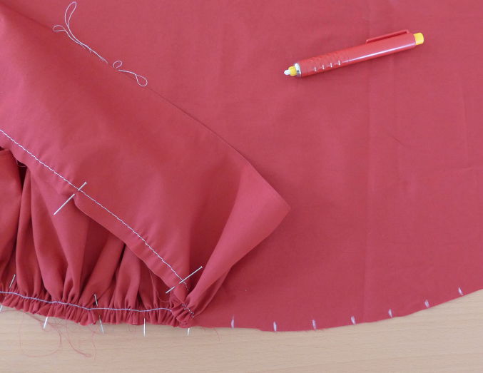 Um bei mehreren Metern Rüsche eine bestimmte Rüschung und gleichmäßige Verteilung zu erreichen markiere ich die Rüsche und den Rock entsprechend. Den Rock habe ich in 3 cm und die Rüsche in 10 cm Abständen markiert. Dadurch ergibt sich eine Rüschung von 3,3. Die beiden Stoffe steckt man mit einer Nadel an den Markierungen zusammen. Dann zieht man an einem der beiden Fäden und schiebt den Stoff darauf zusammen, bis die folgenden Markierungen auf Rüsche und Rock übereinander liegen. Die beiden Teile werden wieder mit einer Nadel feststeckt. Den Faden etwas stramm ziehen und die Kräusel in dem Abschnitt gleichmäßig verteilen. Den gleichen Vorgang wiederholt man nun bis zum Ende der Rüsche.